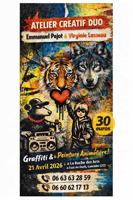 Organisé par l'association La ruche des Arts, à Coat An Doc'h. Envie d'explorer votre créativité sans aucune expérience préalable en dessin ou peinture ? Rejoignez les ateliers d'Emmanuel Pajot, artiste passionné, pour une immersion dans des techniques artistiques modernes et accessibles à tous les âges. Découvrez le plaisir de manier des bombes aérosols sans odeurs pour des créations vibrantes, l'art du pochoir pour des motifs précis et originaux, et l'énergie du pop graffiti. Laissez-vous inspirer par l'univers des vinyles 33 tours, supports insolites pour vos œuvres, ou sur des petites toiles. Un atelier peinture animalière est également proposé avec l'artiste Virginie Lusseau. Que vous soyez jeune ou moins jeune, ces ateliers sont conçus pour le tout public, dans une ambiance conviviale et stimulante. Venez libérer votre potentiel artistique ! 30€.